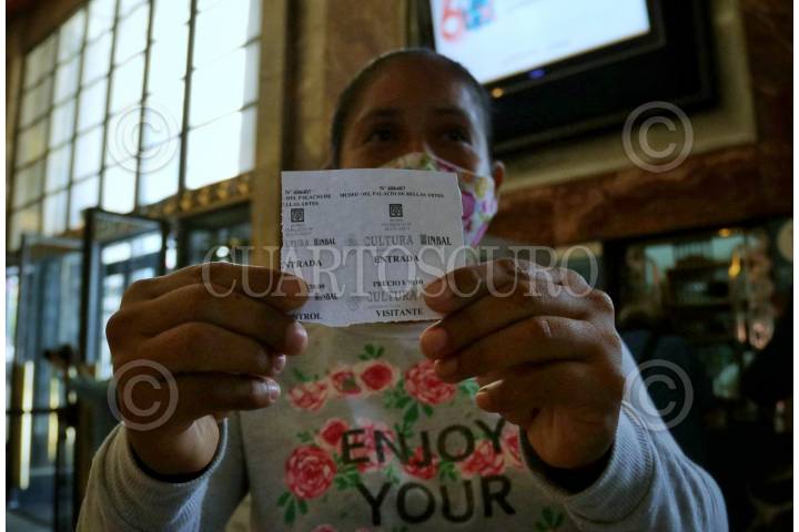 Mujer posa con su boleto para ingresar al Palacio de Bellas Artes, el cual estuvo cerrado durante 6 meses para evitar aglomeración por ende el contagio del coronavirus