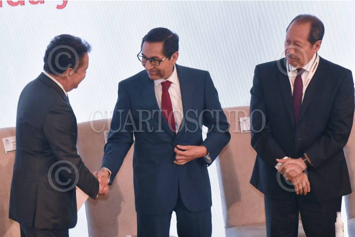 Rogelio Ramírez de la O, secretario de Hacienda y Crédito Público, junto a Ignacio Mier y Leonel Godoy, diputados de Morena, durante la Quinta Reunión Plenaria del grupo parlamentario de Morena correspondiente al último año se ejercicio constitucional de la LXV Legislatura de la Cámara de Diputados.