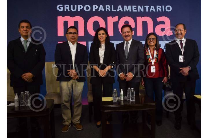 Luisa María Alcalde, secretaria de Gobernación, durante su participación en la Quinta Reunión Plenaria del grupo parlamentario de Morena correspondiente al último año se ejercicio constitucional de la LXV Legislatura de la Cámara de Diputados. Estuvieron presentes los diputados: Ignacio Mier,; Leonel Godoy, Carlos Puente y Aleida Alavez.