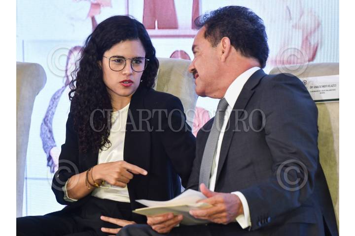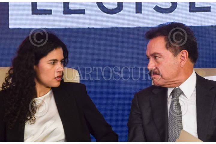 Luisa María Alcalde, secretaria de Gobernación, e Ignacio Mier, diputado y coordinador de Morena, durante la Quinta Reunión Plenaria del grupo parlamentario de Morena correspondiente al último año se ejercicio constitucional de la LXV Legislatura de la Cámara de Diputados.