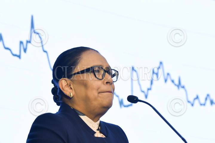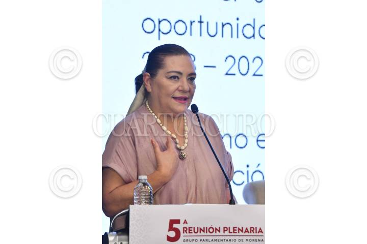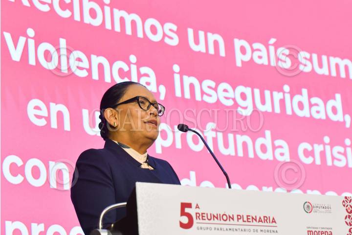 Rosa Icela Rodríguez, secretaria de Seguridad y Protección Ciudadana, durante su participación en la Quinta Reunión Plenaria del grupo parlamentario de Morena correspondiente al último año se ejercicio constitucional de la LXV Legislatura de la Cámara de Diputados.