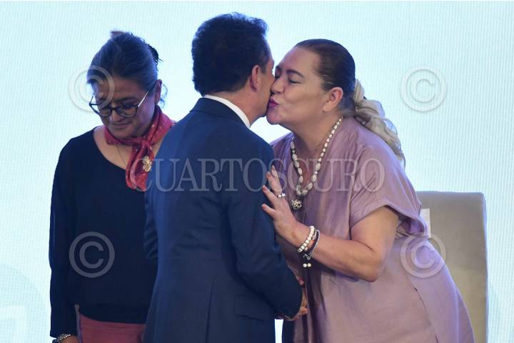 Guadalupe Tadei, saluda con un beso a Ignacio Mier, diputado y coordinador de Morena, durante la Quinta Reunión Plenaria del grupo parlamentario de Morena correspondiente de la LXV Legislatura de la Cámara de Diputados.