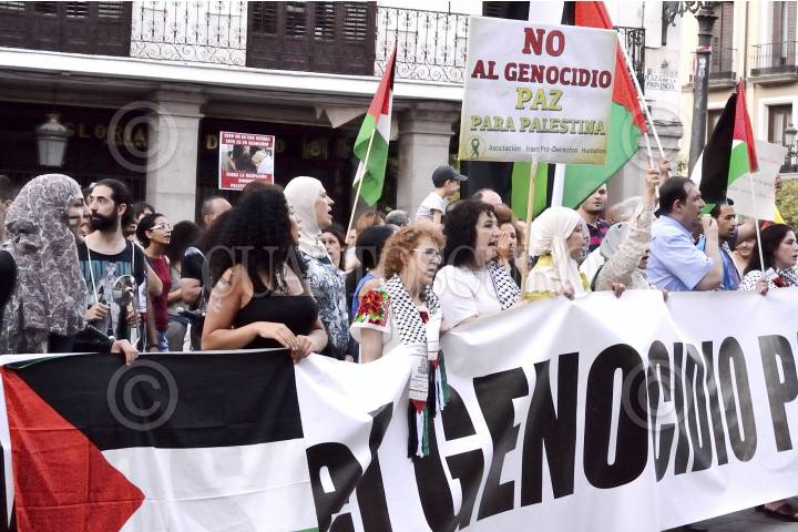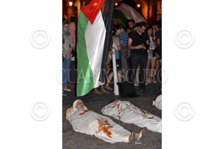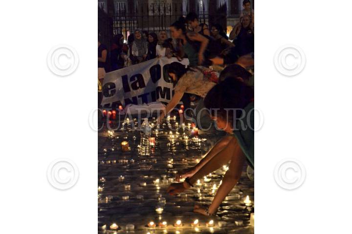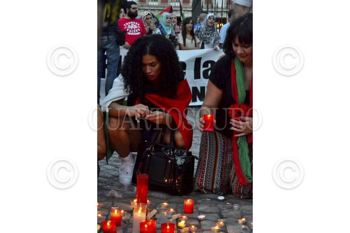 MADRID, ESPAÑA, 07AGOSTO2014.- Cientos de personas se manifestaron hoy contra la guerra en Gaza, Palestina, haciendo una ceremonia de duelo en la Plaza Mayor de Madrid por los más de 2 mil palestinos muertos en la actual guerra y solicitando el cese de la ofensiva de Israel. Un grupo de 4 activistas se pusieron mortajas y se tendieron en el piso, mientras los manifestantes prendían velas y exigían el cese definitivo de la guerra. FOTO: IVÁN RENDÓN /CUARTOSCURO.COM