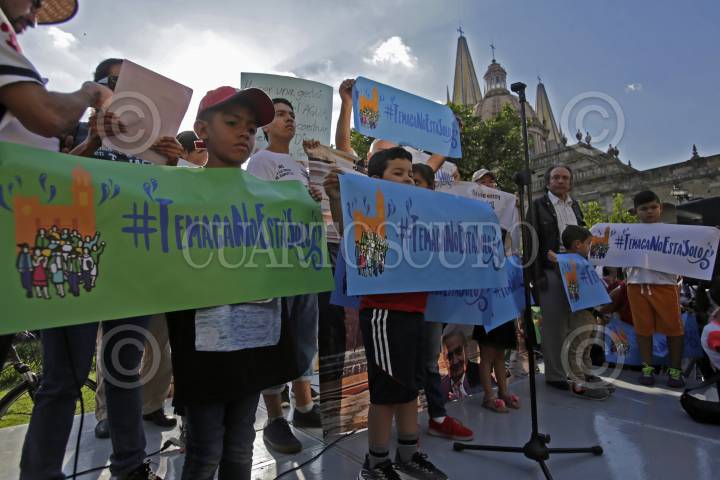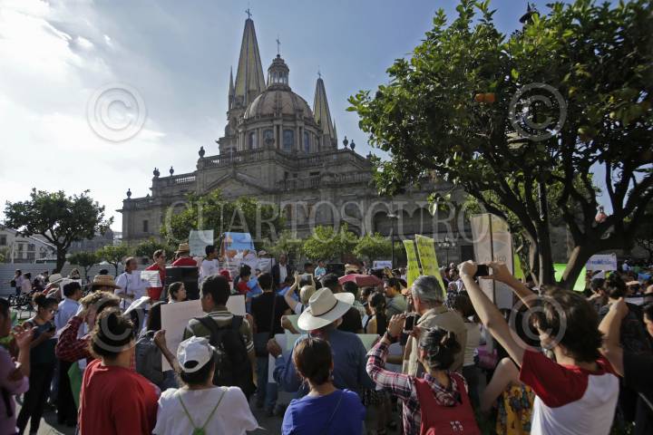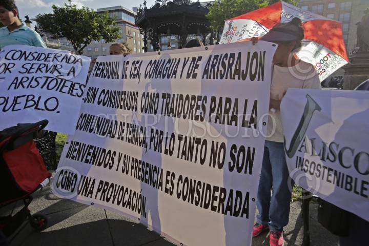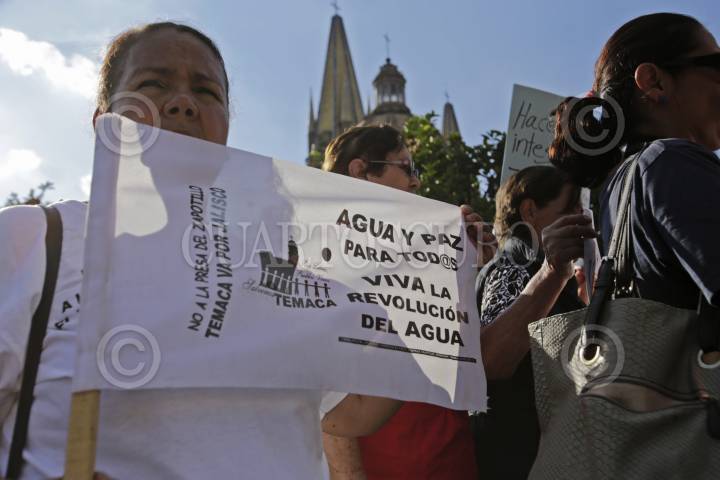 GUADALAJARA, JALISCO. 06JULIO2016.- Pobladores de Temacapulín, Acasico y Palmarejo, apoyados por ciudadanos del Área Metropolitana de Guadalajara, de los Altos de Jalisco y hasta algunas personas de León, Guanajuato, protestaron a las afueras de Palacio de Gobierno, en contra de la Presa El Zapotillo, ya que la cortina de 105 metros inundaría los tres poblados ya mencionados. FOTO: FERNANDO CARRANZA GARCIA / CUARTOSCURO.COM