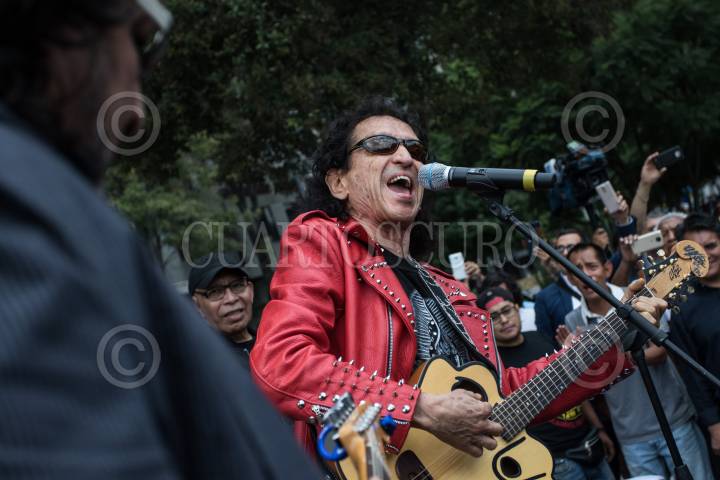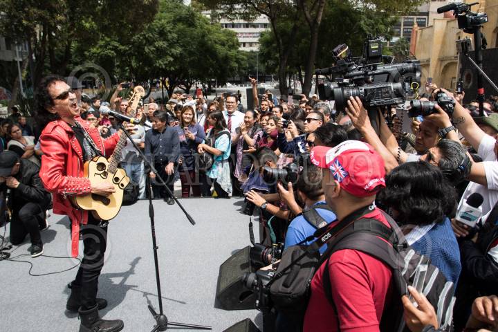 CIUDAD DE MÉXICO, 01OCTUBRE2018.- Alex Lora, líder de la banda de rock mexicano, El Tri, ofreció un palomazo durante la develación del mural "EL Tri: 50 años de rock en México" el cual se encuentra a un costado de la plaza Tlaxcoaque en el centro de la Ciudad de México. FOTO: MISAEL VALTIERRA / CUARTOSCURO.COM