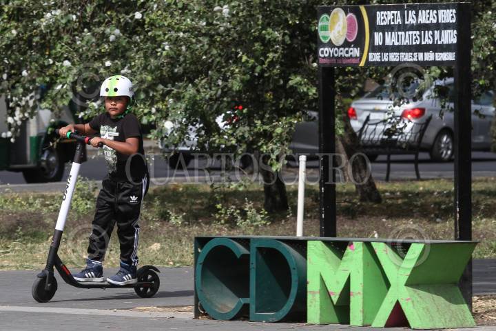 Niño recorre el Parque Alameda Sur en su patín eléctrico.
