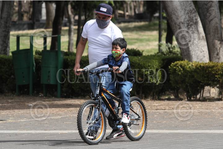 Padre ayuda a su hijo durante su andar él bicicleta en el Parque Alameda Sur.