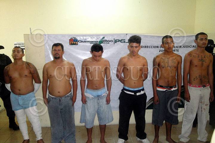 CANCÚN, QUINTANA ROO, 03SEPTIEMBRE2010.- La policía de Cancún y el ejército mexicano detuvieron a 6 pandilleros de la banda "Los Sureños" que fueron presentados el día de hoy involucrados en el incendio donde fallecieron ocho personas, confirmó hoy en conferencia de prensa el procurador Francisco Alor Quezada. FOTO: AMARANTA PRIETO/CUARTOSCURO.COM
