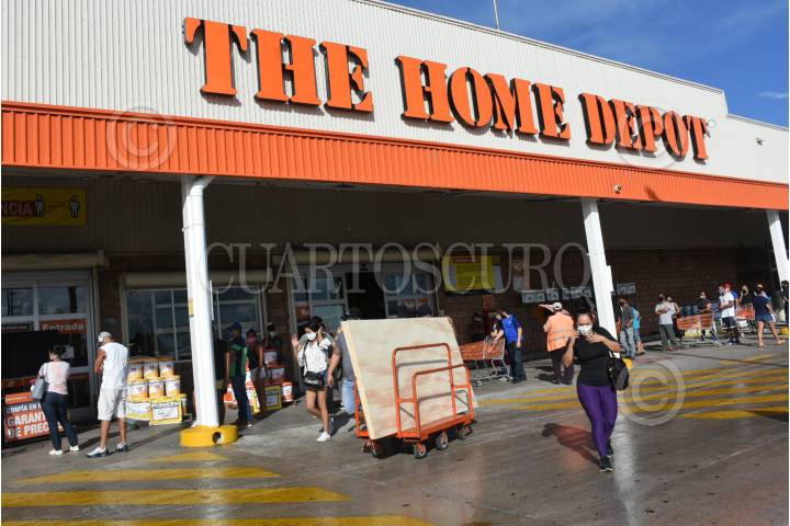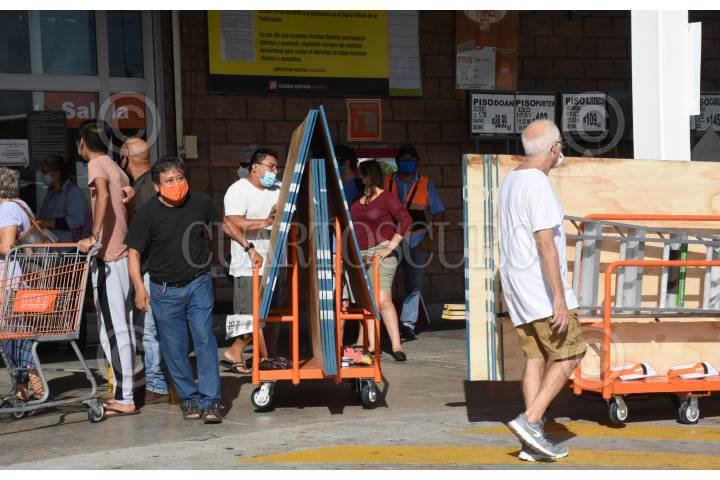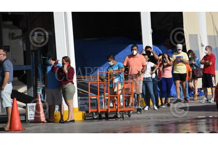 Ciudadanos formaron largas filas en centros comerciales para comprar víveres y material para reforzar ventanas y puertas de sus casa ante la inminente llegada del huracán Delta a Quintana Roo.