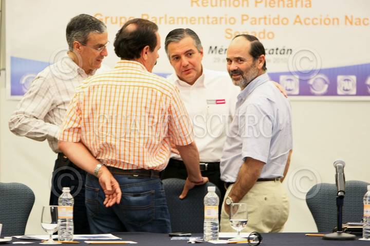 MERIDA, YUCATAN, 31ENERO2010.- El secretario general del PAN el senador José González Morfin, Heriberto Félix Guerra, Secretario de Desarrollo Social y el Coordinador Parlamentarios del PAN en el Senado de la República Gustavo Madero durante la reunión plenaria de los senadores panistas. FOTO: CUARTOSCURO.COM