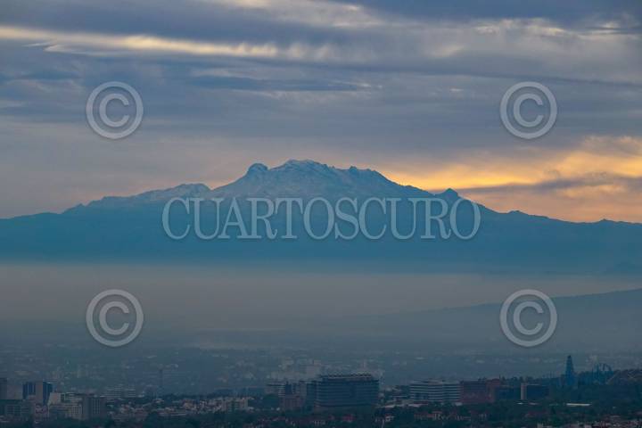 CIUDAD DE MÉXICO, 23DICIEMBRE2024.- Debido a la entrada del invierno se registraron las primeras nevadas en zonas montañosas que se encuentran en la periferia de la ciudad de México. En imagen el volcán Iztaccíhuatl cubierto de nieve, el cual parece levitar sobre la ciudad. FOTO: ROGELIO MORALES /CUARTOSCURO.COM