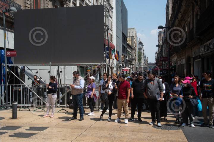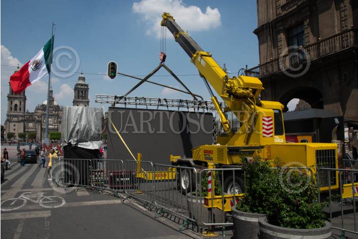 Colocación de pantallas en las calles cercanas del Zócalo capitalino previo a la concentración "Fiesta por la soberanía nacional" que se realizará mañana con la presencia de Andrés Manuel López Obrador, presidente de México.