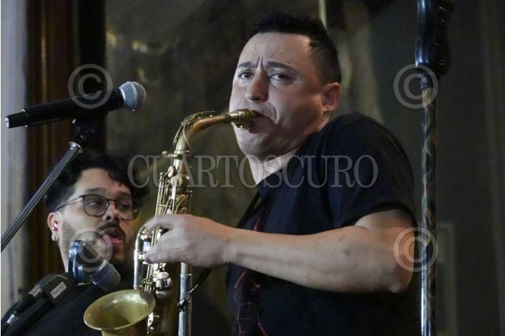 CIUDAD DE MÉXICO, 27MARZO2025.- El saxofonista Misael Oseguerra de la banda de rock en español Panteón Rococo durante la interpretación de algunas de sus rolas en el bar La Faena con motivo de su 30 Aniversario. FOTO: GRACIELA LÓPEZ /CUARTOSCURO.COM