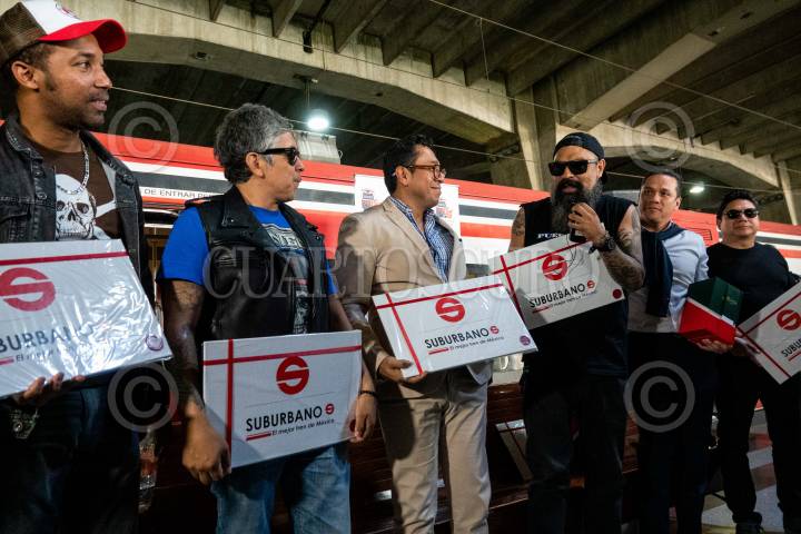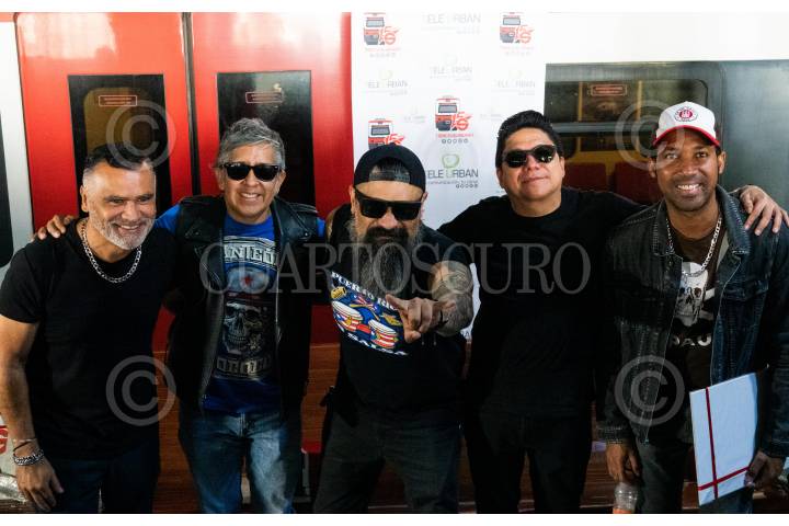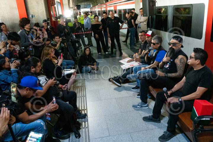 CIUDAD DE MÉXICO, 12OCTUBRE2023.- La banda de ska mexicano Panteón Rococó ofreció conferencia de prensa tras el concierto acústico gratuito a bordo de una unidad del tren suburbano que partió desde Buenavista. La agrupación expresó que esta presentación les remontó a su juventud de cuando ellos mismo usaban el transporte público y a su vez conectar de manera orgánica con su público. La muestra forma parte de la jornada Concierto en Movimiento. FOTO: GALO CAÑAS/CUARTOSCURO.COM