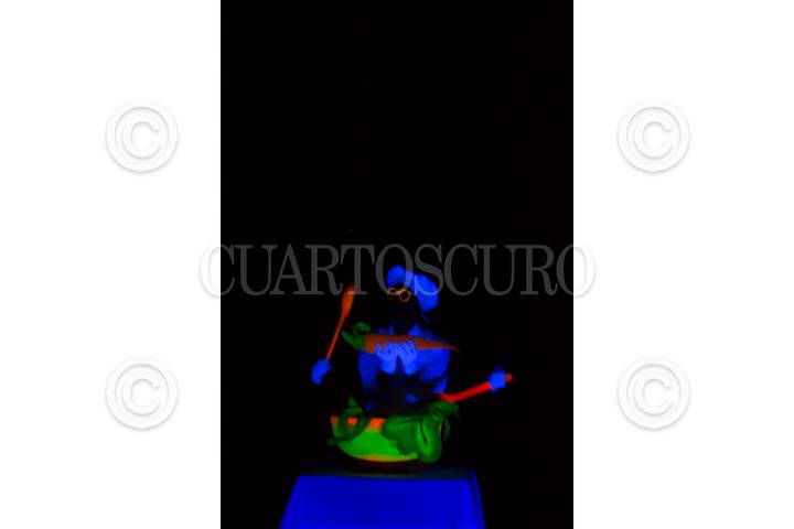 MEXICO, D.F., 13SEPTIEMBRE2014.- Entre luces de neón, colores chillantes y una oscuridad en el recinto, la compañía de teatro infantil Frederik se presentó en el Faro Milpa Alta, al sur de la ciudad, en el marco del 4° Festival de circo, pantomima y clown, organizado por esta institución que se dedica a la difusión de la cultura y el arte. En la imagen, aspectos de un acto con luz negra. FOTO: DAVID POLO /CUARTOSCURO.COM