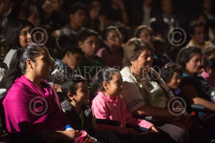 MEXICO, D.F., 13SEPTIEMBRE2014.- Entre luces de neón, colores chillantes y una oscuridad en el recinto, la compañía de teatro infantil Frederik se presentó en el Faro Milpa Alta, al sur de la ciudad, en el marco del 4° Festival de circo, pantomima y clown, organizado por esta institución que se dedica a la difusión de la cultura y el arte. En la imagen, las risas de chicos y grandes no se hicieron esperar ante la comicidad de algunos actos. FOTO: DAVID POLO /CUARTOSCURO.COM