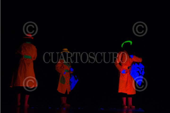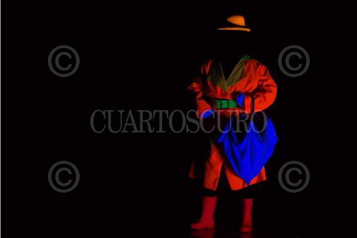 MEXICO, D.F., 13SEPTIEMBRE2014.- Entre luces de neón, colores chillantes y una oscuridad en el recinto, la compañía de teatro infantil Frederik se presentó en el Faro Milpa Alta, al sur de la ciudad, en el marco del 4° Festival de circo, pantomima y clown, organizado por esta institución que se dedica a la difusión de la cultura y el arte. En la imagen, aspectos de un acto con luz negra que recuerda la obra del pintor René Magritte. FOTO: DAVID POLO /CUARTOSCURO.COM