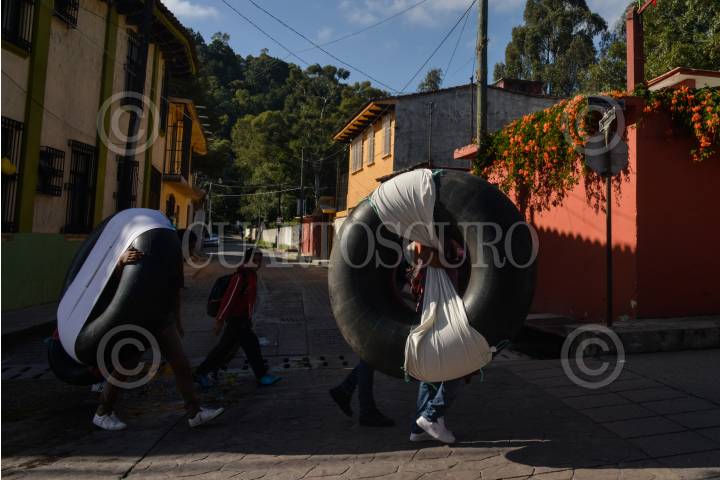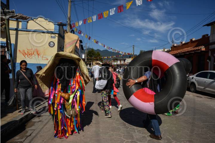 SAN CRISTOBAL DE LAS CASAS, CHIAPAS, 22SEPTIEMBRE2019.- Se llevó a cabo el tradicional desfile del Barrio de la Merced, donde se reúnen cientos de colonos disfrazados con llantas de maquinaria pesada y mascaras para acompañar en su recorrido por las calles principales de la ciudad a la Virgen de la Merced. FOTO: ISABEL MATEOS /CUARTOSCURO.COM