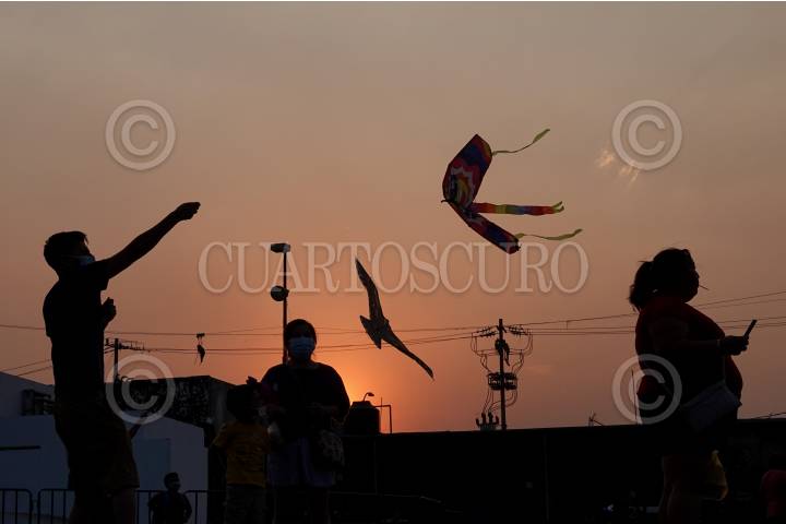 Familias vuelan papalotes durante el atardecer en la alcaldía Iztapalapa