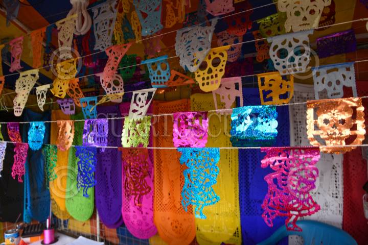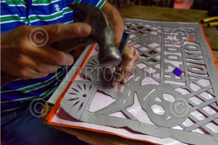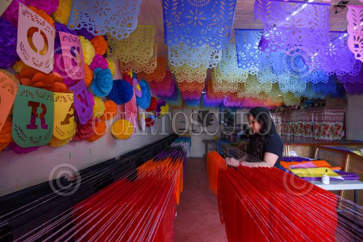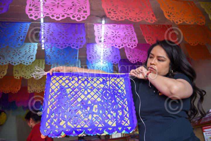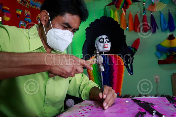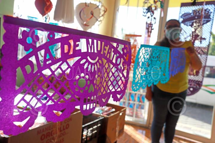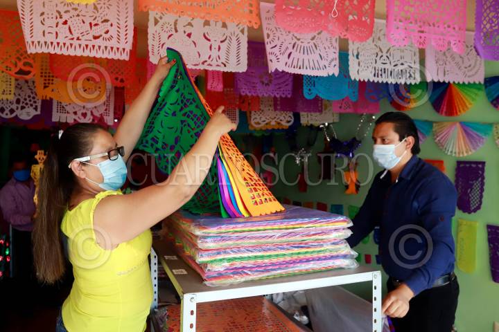 Bajas Ventas de papel picado en el municipio de Huixcolotla han orillado a los artesanos a buscar alternativas de negocios. En el taller Los Cartelitos mantienen la tradición de la elaboración como cada año, añadiendo promociones por temporada para sobrellevar la Contingencia