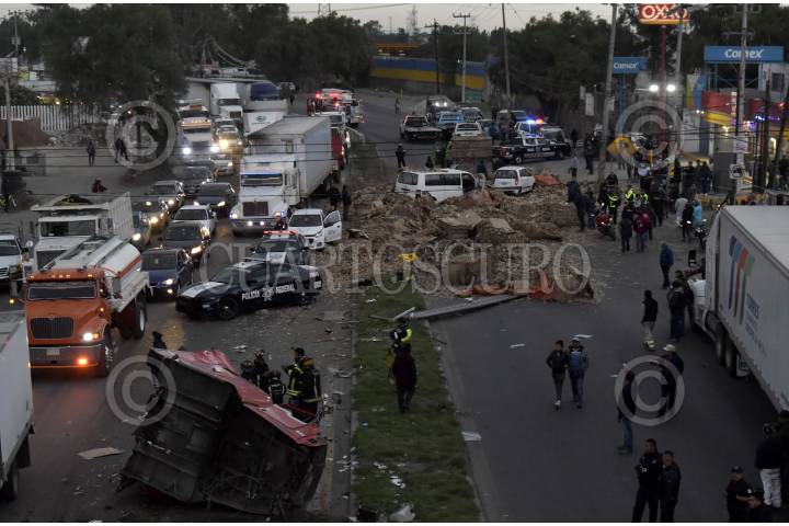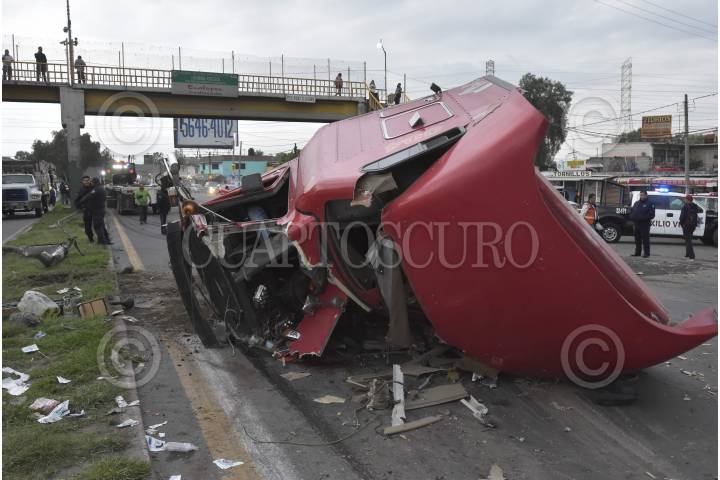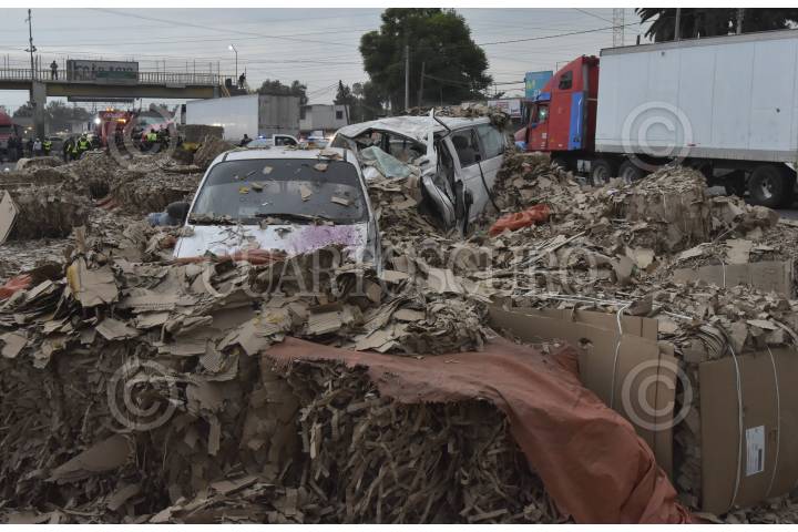 TEXCOCO, ESTADO DE MÉXICO, 13JUNIO2019.- Un trailer volcó sobre la carretera Lechería-Texcoco, la pesada unidad transportaba papel periódico para reciclar, los pesos cubos del material cayeron encima de dos autos lo que provocó la muerte de una mujer. FOTO: ARMANDO MONROY /CUARTOSCURO.COM