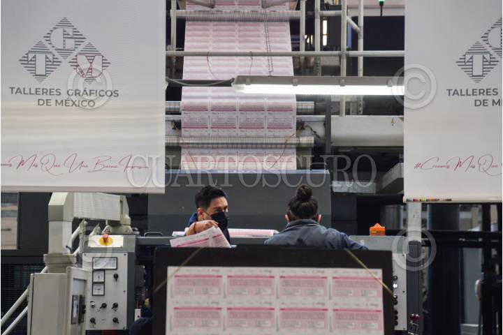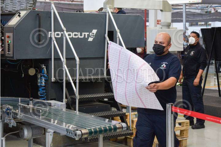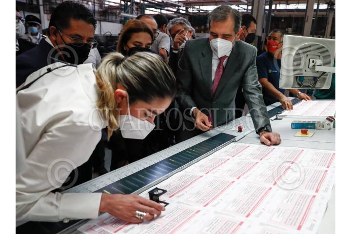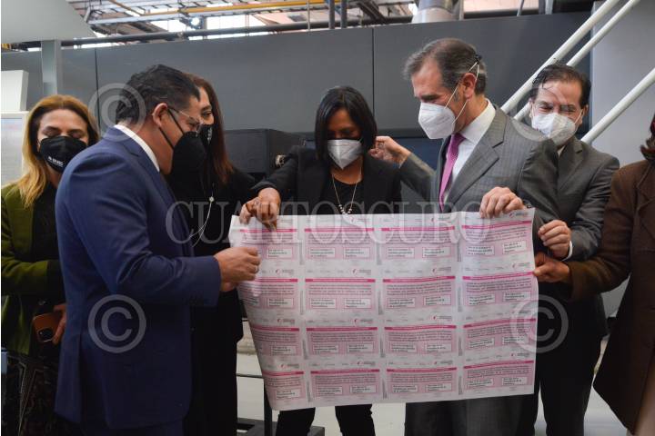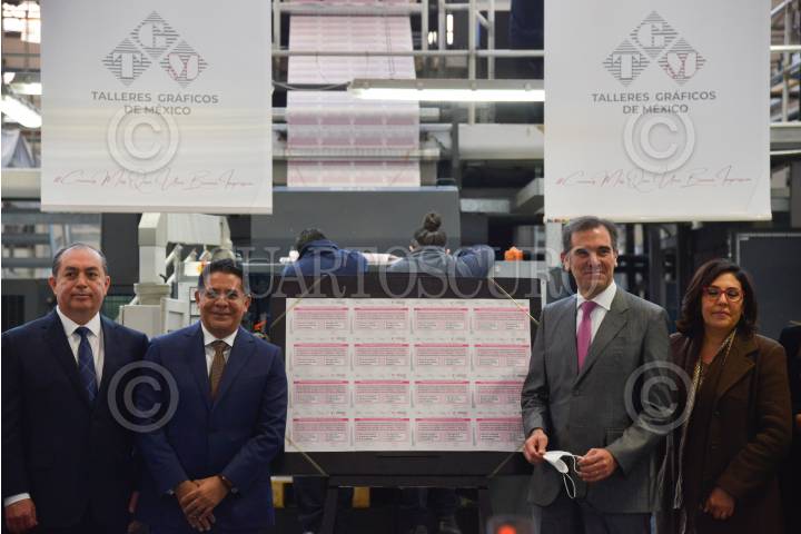 Lorenzo Córdova, consejero presidente del Instituto Nacional Electoral; Rabindranath Salazar Solorio; Subsecretario de Desarrollo Democrático, Participación Social y Asuntos Religiosos de la Segob; y Abraham Ezequiel Zurita Capdepont, director General de Talleres de México, encabezaron el arranque de la impresión de la papeleta para la consulta ciudadana con motivo de la revocación de mandato.