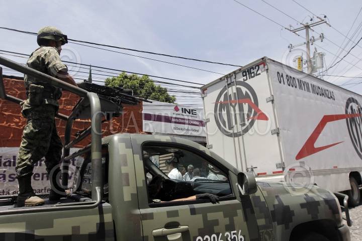 PUEBLA, PUEBLA, 09MAYO20015.- Arriba paquetería electoral con las boletas para la elección de diputados federales a las juntas distritales del Instituto Nacional Electoral INE, el flete fue escoltado por elementos del ejercito. FOTO: HILDA RÍOS/ CUARTOSCURO.COM
