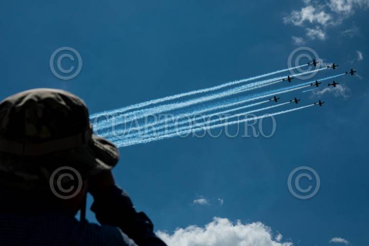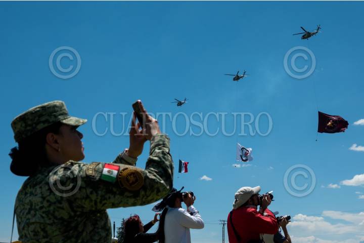 ATLANGATEPEC, TLAXCALA, 12SEPTIEMBRE2025.- Un militar graba el paso de helicópteros de las Fuerzas Armadas durante el ensayo de la Parada Aérea Militar con motivo del desfile alusivo al 215 aniversario del inicio de la Guerra de Independencia de México. El acto se realizó en las inmediaciones de la Estación Aérea Militar No. 9 de la SEDENA. FOTO: GALO CAÑAS/CUARTOSCURO.COM