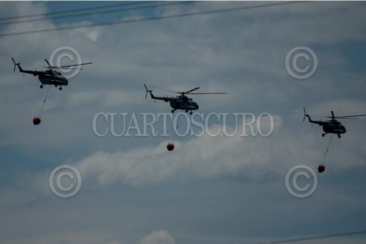 ATLANGATEPEC, TLAXCALA, 12SEPTIEMBRE2025.- Aeronaves vuelan en formación durante el ensayo de la Parada Aérea Militar con motivo del desfile alusivo al 215 aniversario del inicio de la Guerra de Independencia de México. El acto se realizó en las inmediaciones de la Estación Aérea Militar No. 9 de la SEDENA. FOTO: GALO CAÑAS/CUARTOSCURO.COM