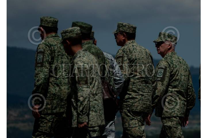 ATLANGATEPEC, TLAXCALA, 12SEPTIEMBRE2023.- Luis Cresencio Sandoval (centro derecha), secretario de la Defensa Nacional, se retira tras el pase de revista general de la Prada Aérea que participará en el 213 aniversario del Grito de Independencia. FOTO: GALO CAÑAS/CUARTOSCURO.COM