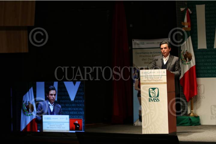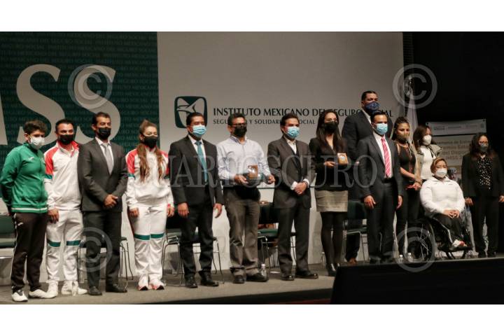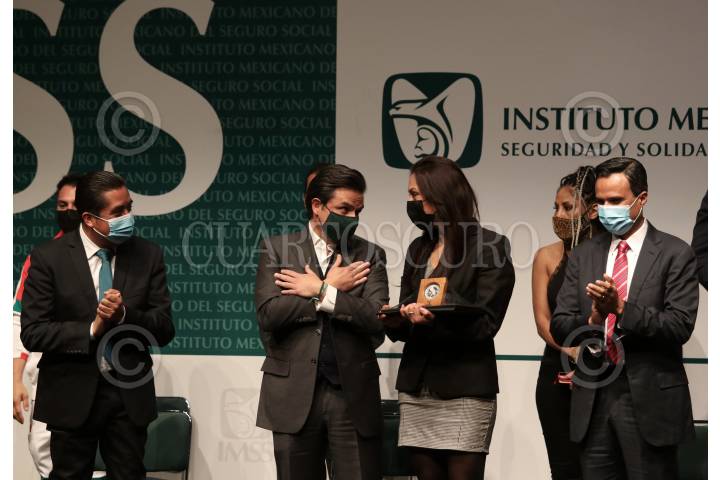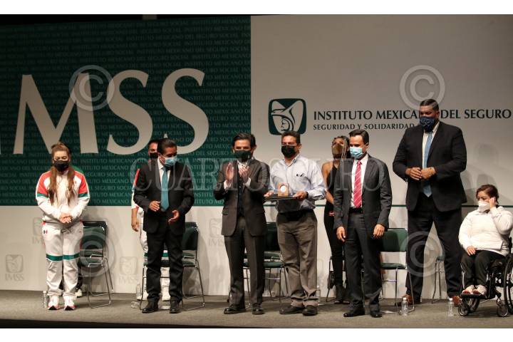 Zoé Robledo Aburto, director general del IMSS; Héctor García, Coordinador del Consejo de Cultura física y deporte y los ganadores de medallas olímpicas; Areli Fuentes, Amalia Pérez Vázquez, Mariana la Barbie Juárez encabezaron la entrega del Premio Estatal del Deporte 2021 a Paola Estrada Santana de vóleibol y Jaime Gallegos, Paraciclista.