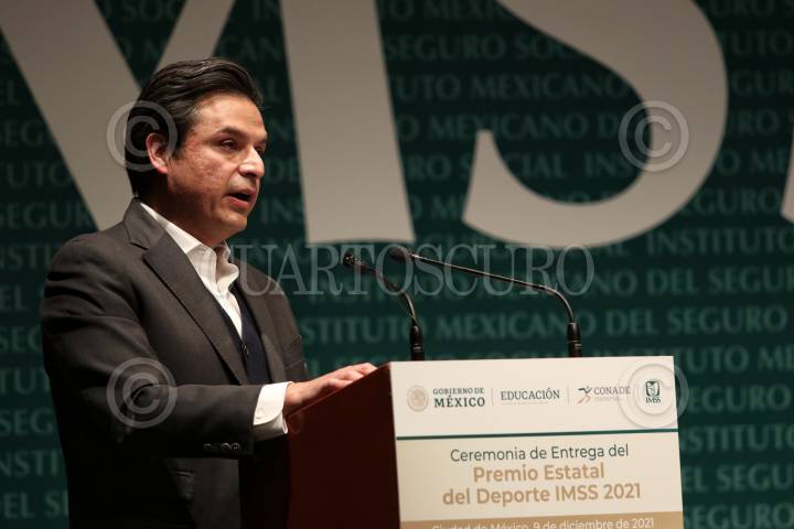 Zoé Robledo Aburto, director general del IMSS durante la entrega del Premio Estatal del Deporte 2021 a Paola Estrada Santana de vóleibol y Jaime Gallegos, Paraciclista.