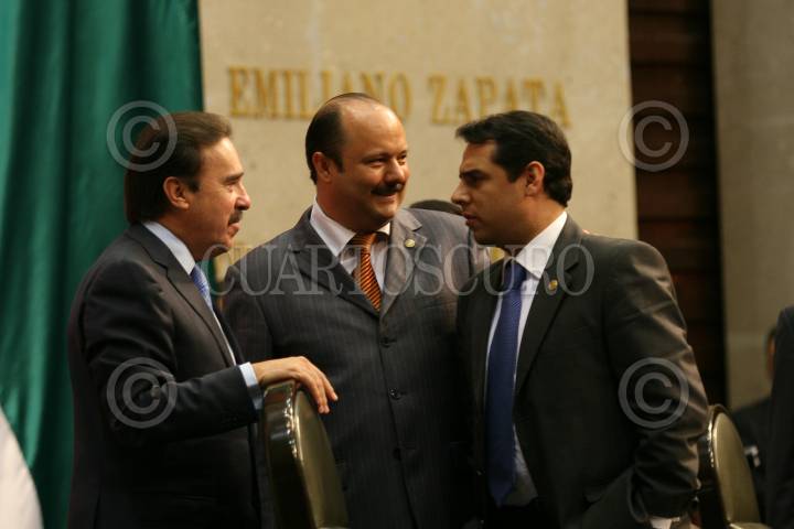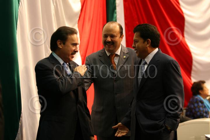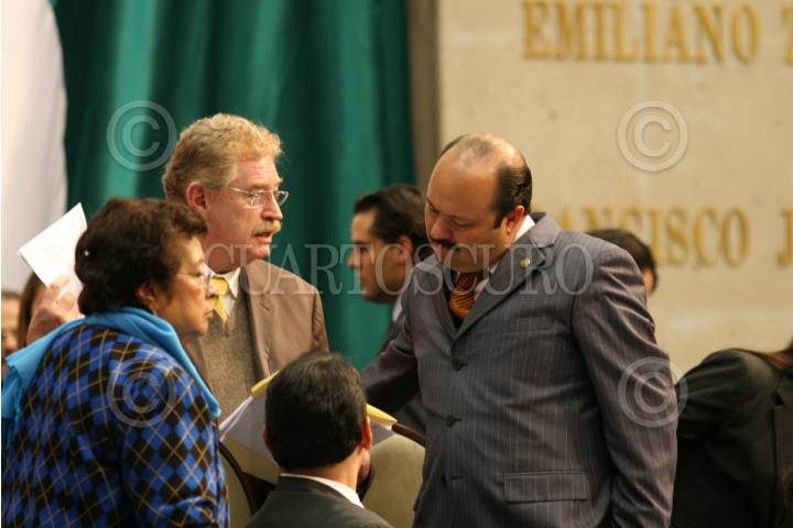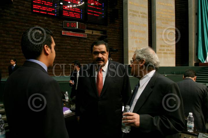 MÉXICO D.F., 16OCTUBRE2008.- Se realizó la sesión ordinaria en la Cámara de Diputados, a la cual acudieron deportistas olímpicos y paraolímpicos, algunos de ellos medallistas en las pasadas olimpiadas que se realizaron en China. En la imagen los diputados del PRI, Emilio Gamboa Patrón y Cesar Duarte, dialogan con Ricardo Aldana, Tesorero de PEMEX. FOTO: GUILLERMO PEREA/CUARTOSCURO.COM