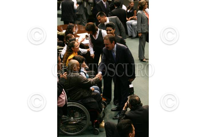 MÉXICO D.F., 16OCTUBRE2008.- Se realizó la sesión ordinaria en la Cámara de Diputados, a la cual acudieron deportistas olímpicos y paraolímpicos, algunos de ellos medallistas en las pasadas olimpiadas que se realizaron en China. En la imagen el diputado Emilio Gamboa Patrón saluda a los deportistas paraolímpicos durante la sesión. FOTO: GUILLERMO PEREA/CUARTOSCURO.COM