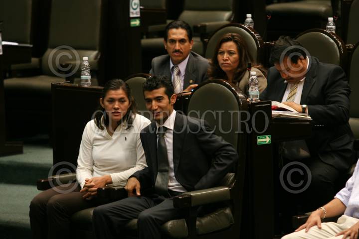 MÉXICO D.F., 16OCTUBRE2008.- Se realizó la sesión ordinaria en la Cámara de Diputados, a la cual acudieron deportistas olímpicos y paraolímpicos, algunos de ellos medallistas en las pasadas olimpiadas que se realizaron en China. En la imagen los medallista olimpicos María Espinoza y Guillermo Perez durante la sesión. FOTO: GUILLERMO PEREA/CUARTOSCURO.COM