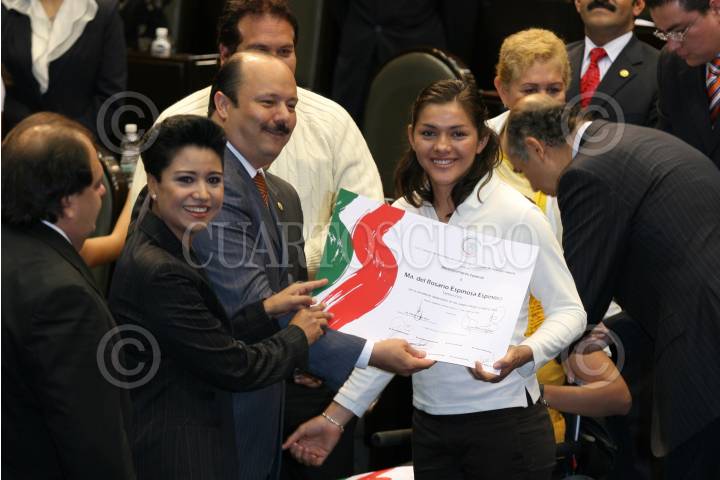 MÉXICO D.F., 16OCTUBRE2008.- Se realizó la sesión ordinaria en la Cámara de Diputados, a la cual acudieron deportistas olímpicos y paraolímpicos, algunos de ellos medallistas en las pasadas olimpiadas que se realizaron en China. En la imagen el diputado Cesar Duarte ,hace entrega del reconocimiento a la medallista, María del Rosario Espinoza. FOTO: GUILLERMO PEREA/CUARTOSCURO.COM