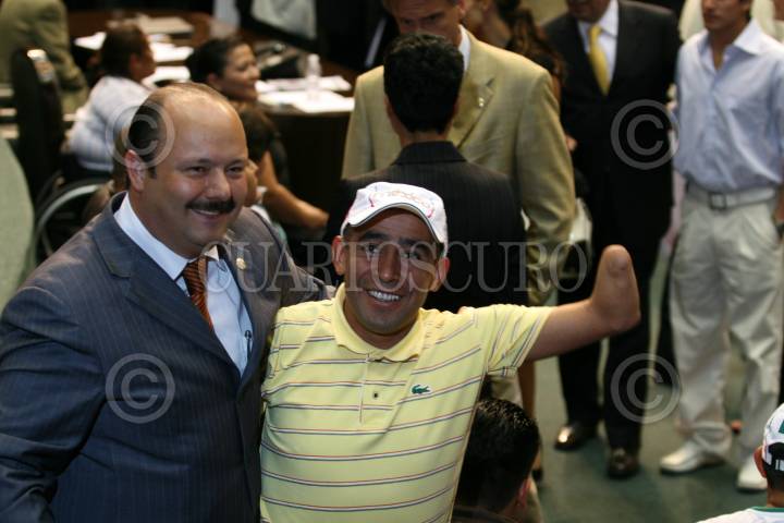 MÉXICO D.F., 16OCTUBRE2008.- Se realizó la sesión ordinaria en la Cámara de Diputados, a la cual acudieron deportistas olímpicos y paraolímpicos, algunos de ellos medallistas en las pasadas olimpiadas que se realizaron en China. En la imagen el diputado Cesar Duarte, hace entrega del reconocimiento a la medallista Nelly Edith Miranda. FOTO: GUILLERMO PEREA/CUARTOSCURO.COM