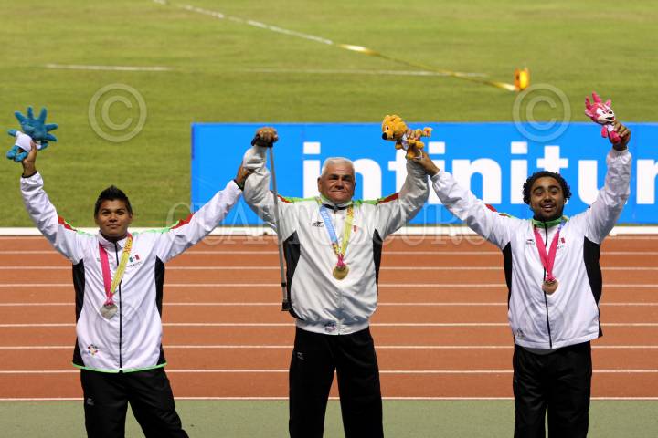 ZAPOPAN, JALISCO, 17NOVIEMBRE2011.- Los mexicanos Alejandro Pérez (Oro), José Aranda (Plata) y Fernando del Rosario González (Bronce) hicieron el 1-2-3 en la prueba de lanzamiento de bala varonil F57/58 en el estadio de atletismo, dentro del marco de los Juegos Parapanamericanos Guadalajara 2011. FOTO: FERNANDO CARRANZA/CUARTOSCURO.COM