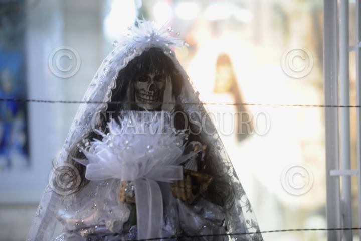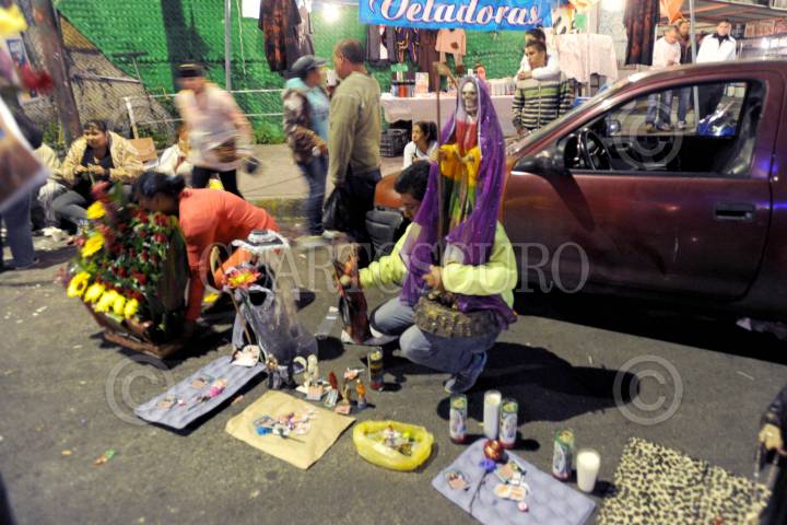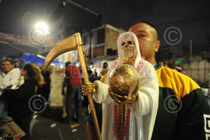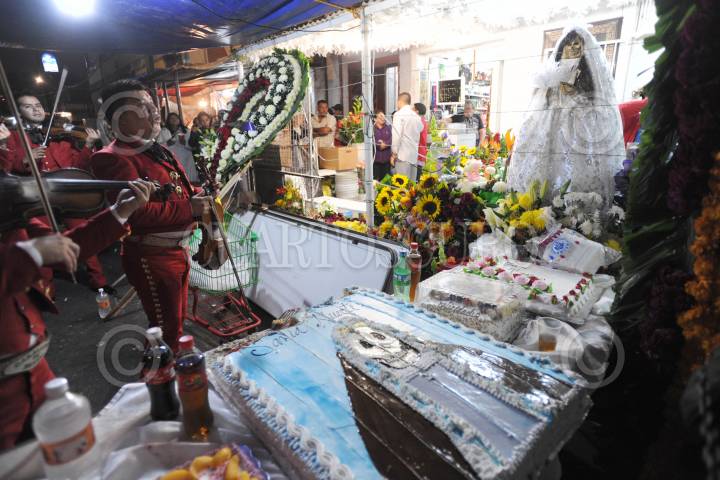 MÉXICO D.F.01NOVIEMBRE2013.- Festejan en la colonia Morelos a la Muerte, en el 13 aniversario del altar que se coloco en la calle de Alfareros casi esquina con Hojalatería por “Dona Queta”. Al lugar arribaron Mariachis y festejaron con pastel y comida para los seguidores. FOTO: LUIS CARBAYO /CUARTOSCURO.COM