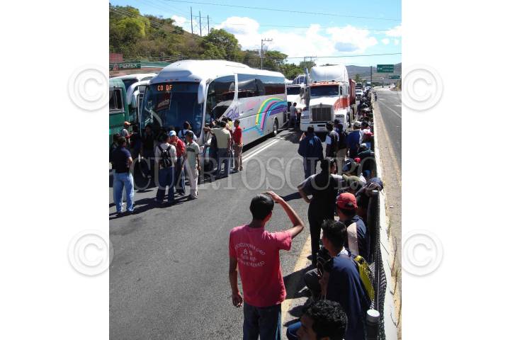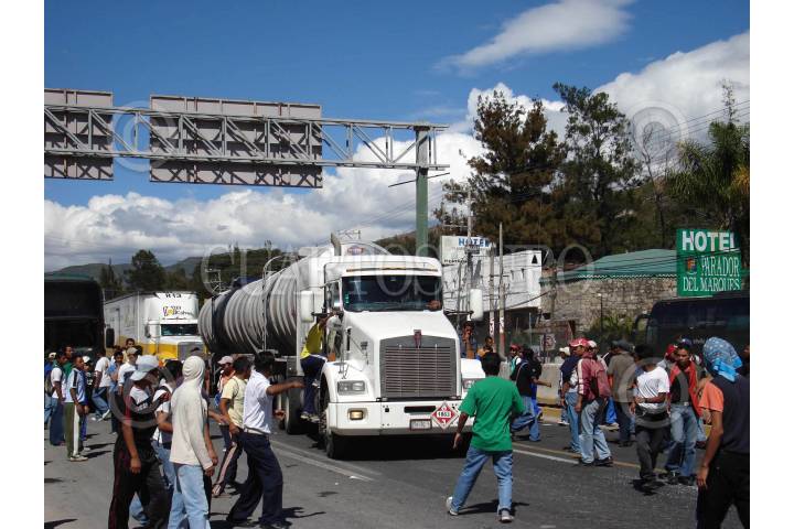 CHILPANCINGO, GUERRERO., 28NOVIEMBRE2007.- Egresados y estudiantes de la normal rural de Ayotzinapa bloquearon parcialmente los carriles centrales de la Autopista del Sol donde paraban a choferes de autobuses y camiones, a quienes les pedian que cooperaran con diesel y gasolina para proveer a los autobuses en los que se trasladan para realizar sus movilizaciones, esto como parte de las protestas que han venido realizando para exigir la entrega de plazas para maestros rurales asi como una audiencia con el gobernador del estado Zeferino Torreblanca Galindo. FOTO: OSCAR ALVARADO/CUARTOSCURO.COM