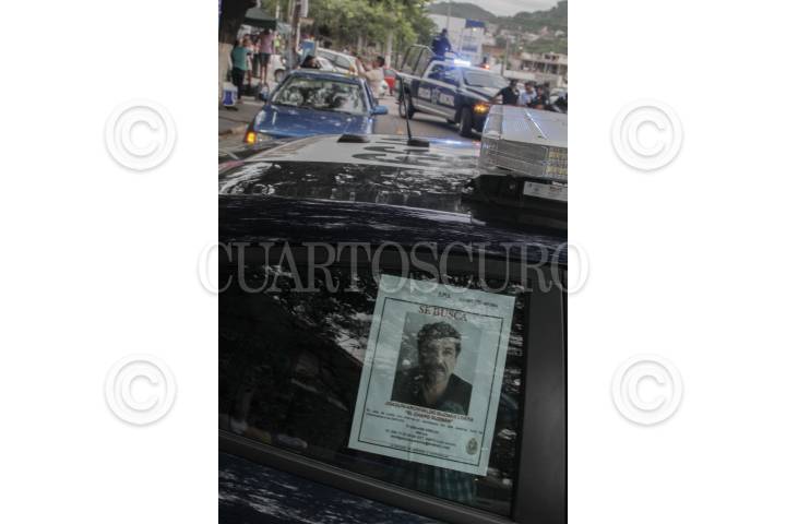 ACAPULCO, GUERRERO, 14JULIO2015.- Durante las investigaciones de rutina que elementos de la Policía Federal y ministeriales realizaban en el lugar en donde una pareja fue asesinada, una fotografía de Joaquín "El Chapo" Guzmán, se encuentra en la ventanilla de una patrulla con la leyenda de "Se busca". FOTO: BERNANDINO HERNÁNDEZ /CUARTOSCURO.COM