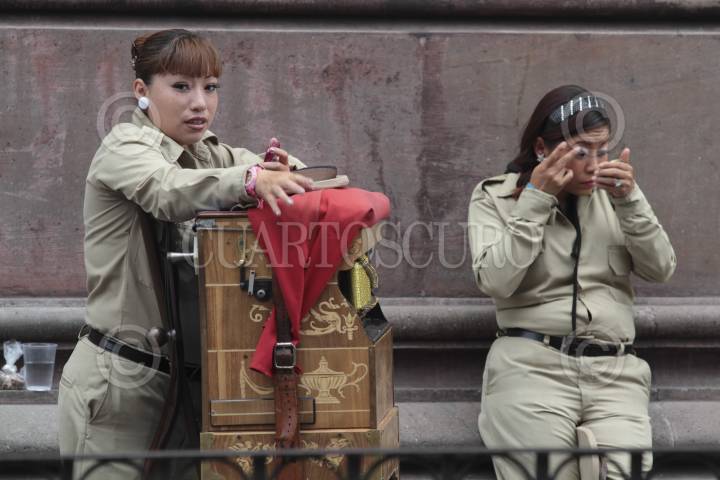 MÉXICO, D.F., 25AGOSTO2013.-Jóvenes organilleras se maquillan antes de comenzar su jornada en la calle de Tacuba. FOTO: JUAN PABLO ZAMORA /CUARTOSCURO.COM