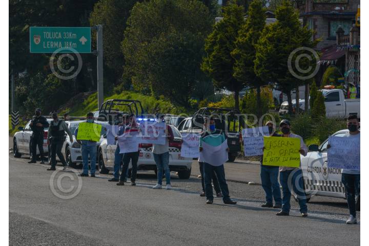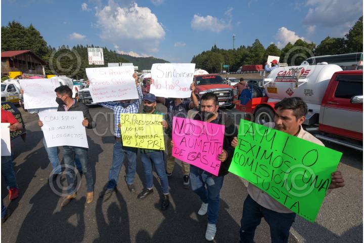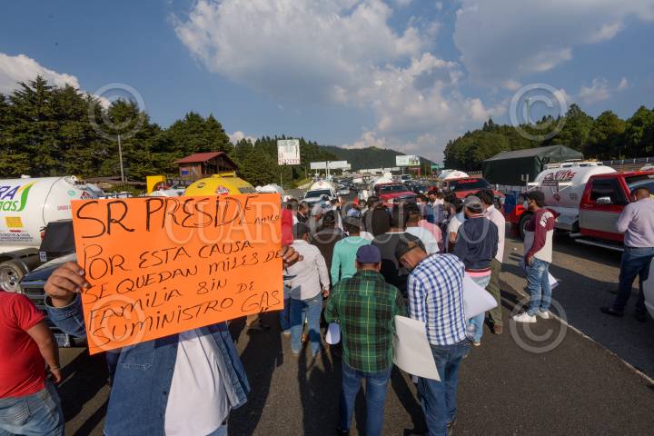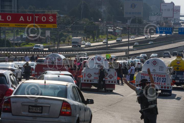 Integrantes del Gremio Nacional de Gaseros bloquearon la carretera México-Toluca exigiendo los tomen en cuenta en la regulación del precio del gas LP.