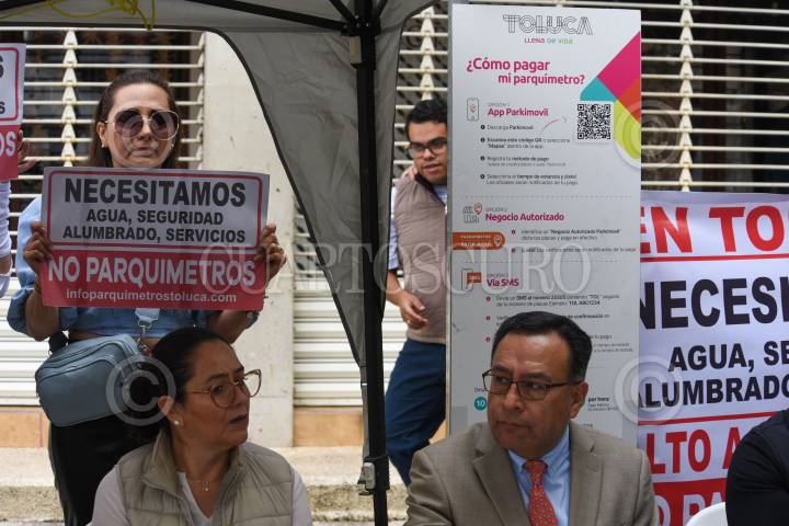 Los ediles de Toluca América Rivera y Mario Cardoso acompañados por vecinos de las colonias Universidad, Américas, Francisco Murguía y la Merced, manifestaron su rechazo a los parquímetros virtuales y condenan los hechos ocurridos el viernes pasado al ser detenidos vecinos y un regidor por policías municipales.