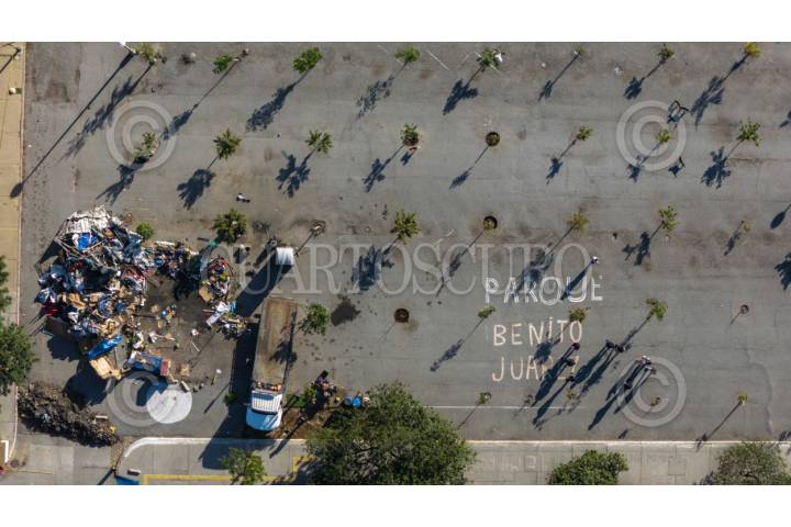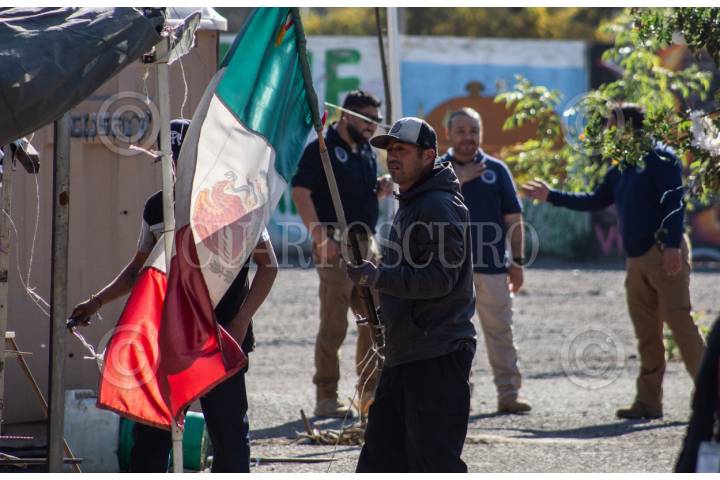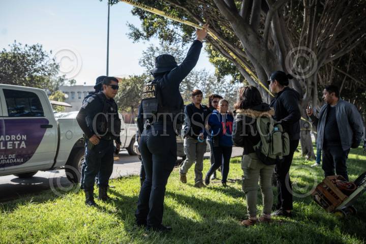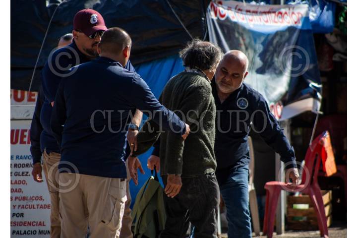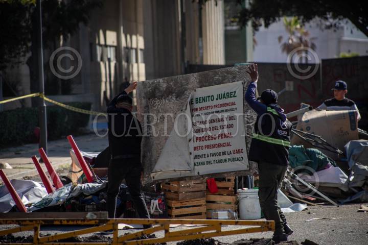 TIJUANA BAJA CALIFORNIA 22MARZO2025.- Autoridades desalojaron la tarde del sábado el campamento de manifestantes que se encontraba en el Parque Benito Juárez, ubicado entre el Palacio Municipal y la UABC en Zona Río. El operativo fue llevado a cabo por casi medio centenar de agentes de la FESC y personal de la Fiscalía, así como alrededor de 20 elementos antimotines. Tras esto al menos dos personas, un hombre y una mujer fueron detenidos. José Luis Paredes Cardoso, defensor del parque, comentó que el desalojo es parte de un proceso de recuperación ilegal de una propiedad que, por decreto presidencial de 1978, fue destinada para plaza cívica y como un parque público. Señaló que fue durante la administración del ex gobernador Jaime Bonilla, cuando se les otorgó el parque a la Asociación Civil, pero fue durante ese mismo gobierno que se tuvo “la gran ocurrencia” de regalárselo al ese entonces rector de la UABC, quien tuviera un parentesco familiar con Bonilla. El activista responsabilizó a la gobernadora Marina del Pilar Ávila de no haber intervenido oportunamente para solucionar el conflicto. Asegura que la mandataria tenía los documentos y las facultades para haber recuperado el predio. "Son 43 mil 257 metros cuadrados lo que el presidente Jose López Portillo entregó el 14 de julio de 1978 este predio, que lo entrego al gobernador de ese entonces, pero no para su propiedad, sino para repartirlo como centro de gobierno”, comentó el activista. Paredes también recordó que el amparo por la defensa del parque sigue vigente desde 2021, y que la lucha por este espacio cumplió precisamente el día de ayer fecha de la conmemoración del Natalicio de Benito Juárez, 15 años. El desalojo se produjo minutos antes de las 16:00 horas, cuando agentes de seguridad comenzaron a llegar al lugar. Desde la glorieta, hasta la Universidad Autónoma de Baja California (UABC) ubicada sobre el Paseo Centenario, se formó un cordón de seguridad que impidió el acceso. En total, alrededor de diez personas fueron desalojadas del parque. "Les pidieron que se fueran por las buenas, pero al final hubo detenidos", indicó un testigo. Tras el operativo de desalojo el campamento de los guardianes del parque Benito Juárez fue destruido y desmantelado por una agencia empresa de seguridad privada, quedando en el lugar sólo los pequeños árboles que habían plantado. Durante la noche, el Gobierno del Estado de Baja California emitió un comunicado señalando que el especio publico fue recuperado para costruir un parque, esto en cumplimiento de una orden del Poder Judicial del Estado. FOTO CHRIS NOYOLA/ CUARTOSCURO.COM
