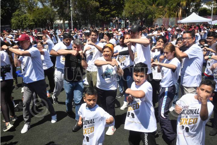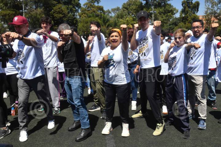 CIUDAD DE MÉXICO, 29MARZO2025.- Clara Brugada, jefa de Gobierno, participó en la clase de boxeo realizada en las instalaciones del Deportivo Plan Sexenal, como parte de los preparativos de la clase masiva de box que se realizará el próximo 6 de abril en el zócalo capitalino. La acompañaron: Mauricio Tabe, alcalde de Miguel Hidalgo, y Miguel Torruco Garza, director nacional de Promoción al Deporte y Bienestar. FOTO: MARIO JASSO/CUARTOSCURO.COM