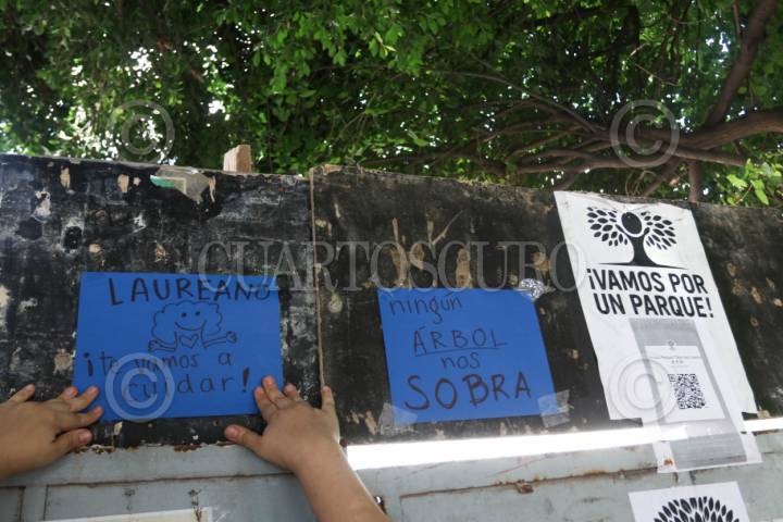 CIUDAD DE MÉXICO, 13JULIO2025.- Vecinos de la colonia Tlacoquemécatl, alcaldía Benito Juárez pegaron carteles frente a la obra en Miguel Laurent 48, en donde exigen su clausura debido a que el árbol Laureano continúa en riesgo y la obra continúa activa, demandan la creación de un parque vibracional y el rechazo de la manipulación política. El Árbol Laureano es un laurel de la India con más de 115 años, dicho nombre fue bautizado por los habitantes de ésta colonia. FOTO: GRACIELA LÓPEZ/CUARTOSCURO.COM