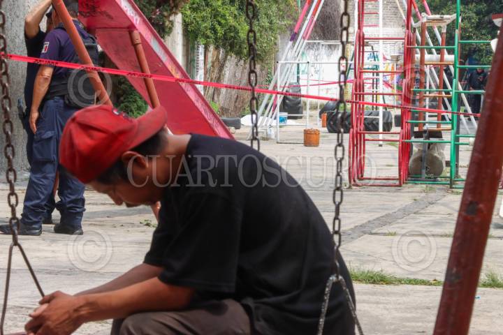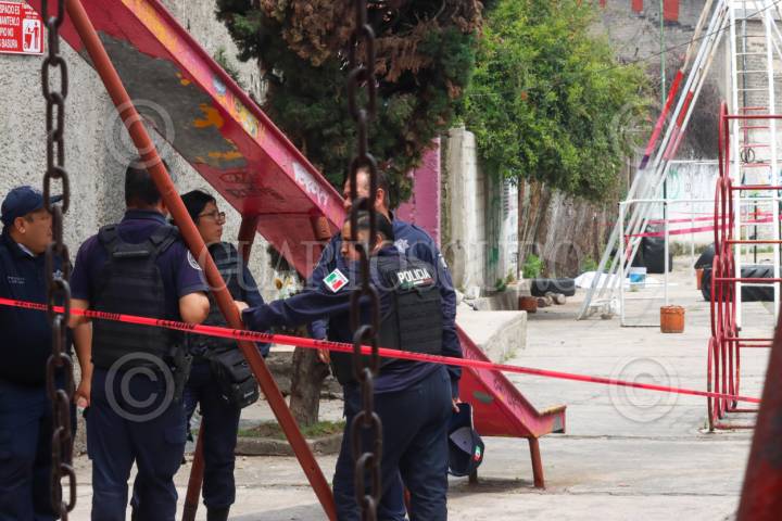 TLALNEPANTLA, ESTADO DE MÉXICO, 21AGOSTO2025.- Cuatro sujetos disfrazados de repartidores de comida rápida, supuestamente responsables del crimen, mataron a balazos al instructor de un parque de calistenia, ubicado en el corredor Cristo Rey, en la colonia San Andrés Atenco. Los presuntos agresores abandonaron las mochilas de repartidor que cargaban al darse a la fuga. En la imagen policía municipal vigilan la zona. FOTO: ROGELIO MORALES / CUARTOSCURO.COM