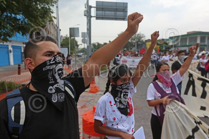Estudiantes de la Normal de Atequiza participan en la manifestación por los 43 normalistas desaparecidos en Ayotzinapa a seis años.