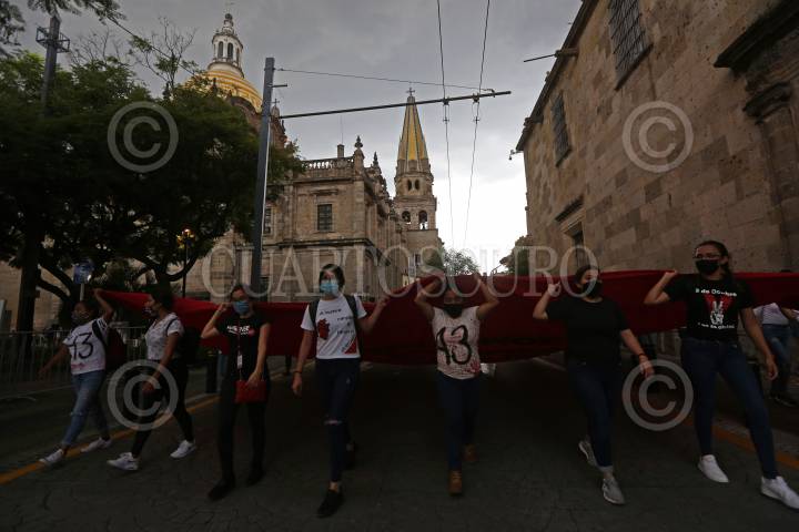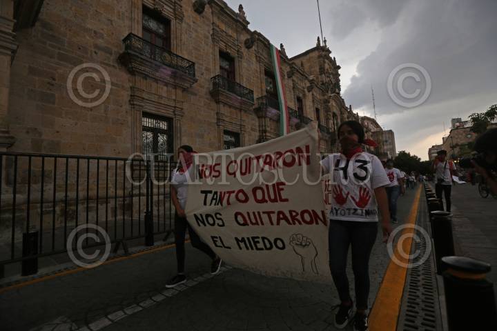 Fotografía general de la manifestación del frente feminista de Jalisco, avanzando por la avenida Juárez con rumbo a Palacio de Gobierno, donde protestaron por la muerte de Victoria Esperanza Salazar, mujer Salvadoreña victima de abuso policial.